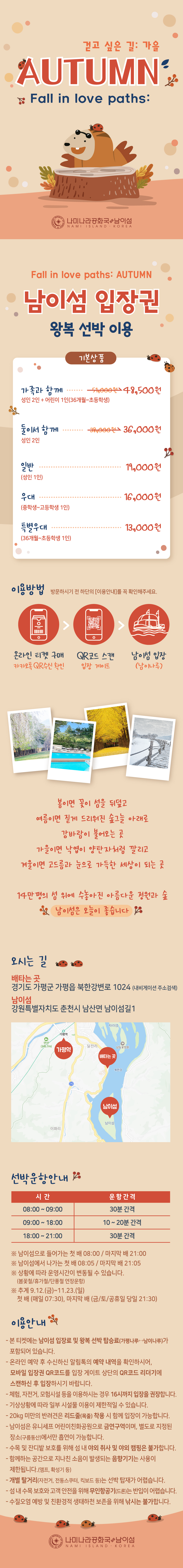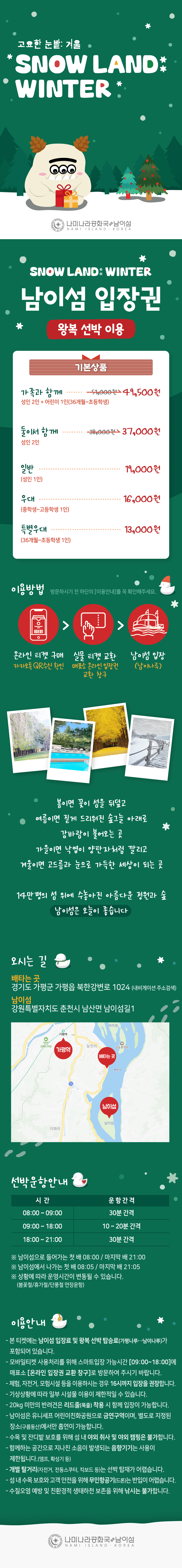 ※ 입장요금에는 왕복선박탑승료(가평나루↔남이나루)가 포함되어 있습니다.