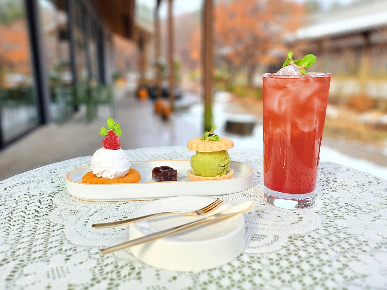 로즈가든그린티 베이스의 딸기 음료 1잔 + 디저트 플레이트(약과&생크림 + 모나카녹차젤라또 + 양갱 한조각)