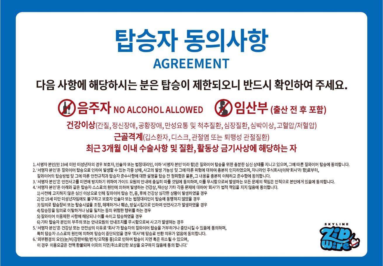 체중: 35kg ~ 120kg (패밀리코스 기준)※ 어드벤처 코스는 최대 100kg 까지 적용됩니다.(기상 상황에 따라 탑승 체중 제한 변동 가능)