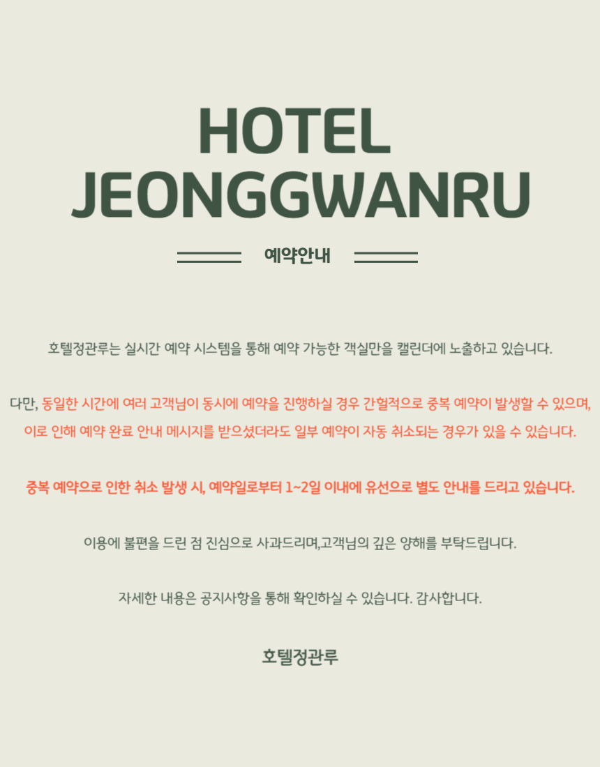 이로 인해 예약 완료 안내 메시지를 받으셨더라도 일부 예약이 부득이하게 취소되는 상황이 발생할 수 있으며,