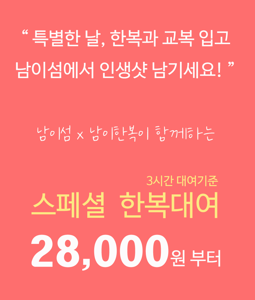 ✨ 남이섬호텔 투숙객은 1박2일동안 한복 20,000원, 교복 15,000원에 제공해 드립니다. 매장으로 전화주세요!