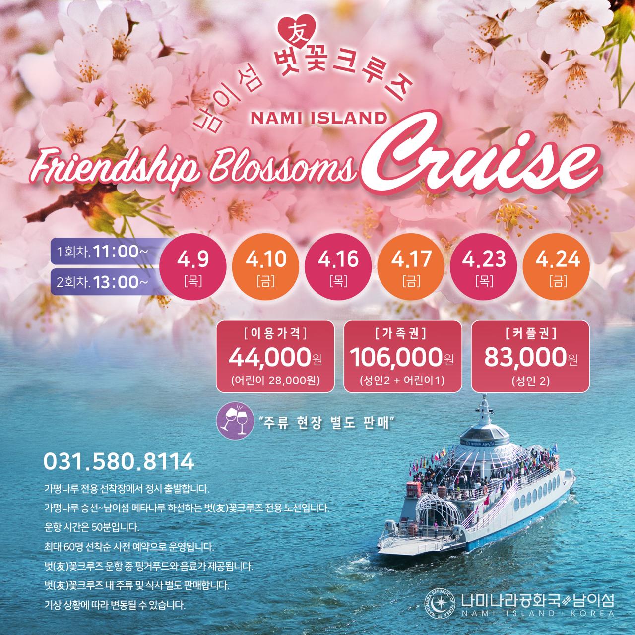 • 벗(友)꽃 크루즈는 정시에 출발합니다. 해당일은 성수기 기간으로 주차 및 교통이 혼잡할 수 있으니 유의해 주시기 바랍니다.